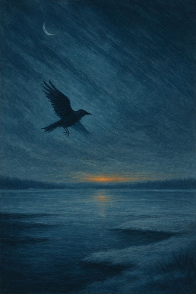 how many storms it took to fill this lake of winter, a bird slow in flight against the wind— how many times has she tried to cross the orange light on the horizon, what message will she leave? my heart should be free by now; still it sinks in water, staring at the ceiling, thinking of that lonely bird pushing the world’s breath aside.